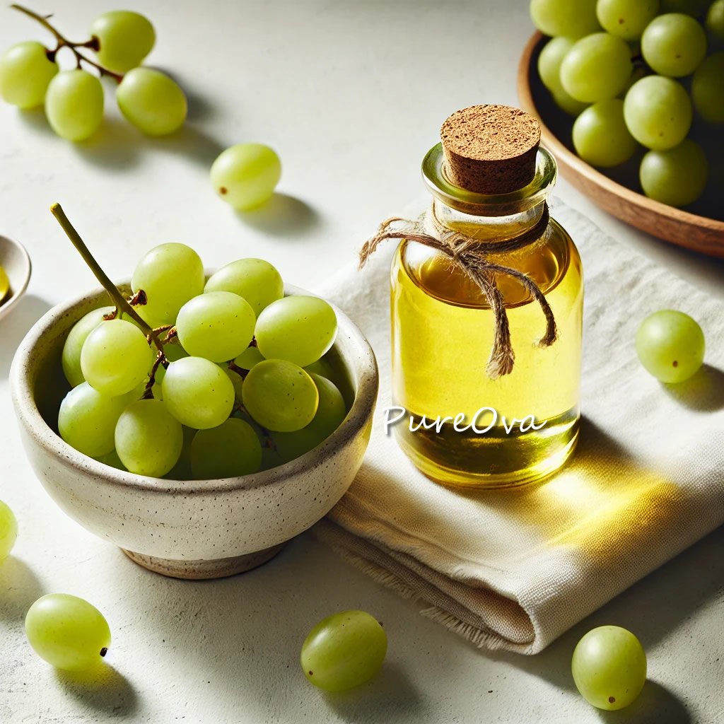 - Feature Image: A bottle of golden grape seed oil next to fresh grapes.